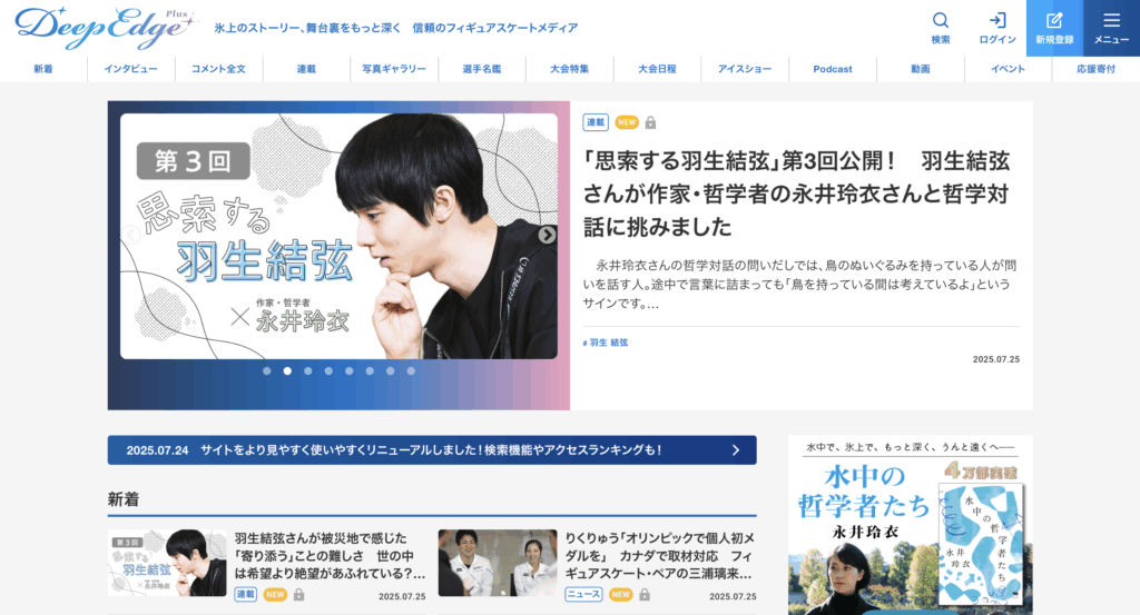 『Deep Edge Plus』は、共同通信社のフィギュアスケート担当記者による、フィギュアスケート専門情報番組です。国内外の大会の取材の裏話や、選手の素顔について紹介しています。