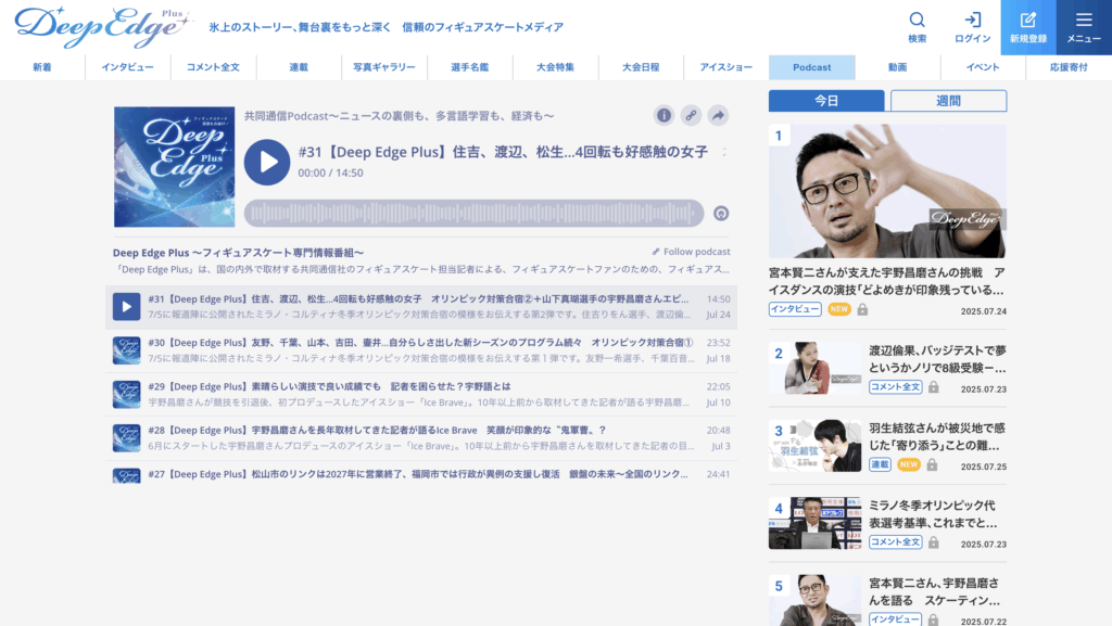この経験があったので、フィギュアスケート専門サイト「Deep Edge Plus」を立ち上げる際に、サイトのPRとしてポッドキャスト番組があったら良いんじゃないかと考え、ポッドキャスト番組『Deep Edge Plus』を企画しました。