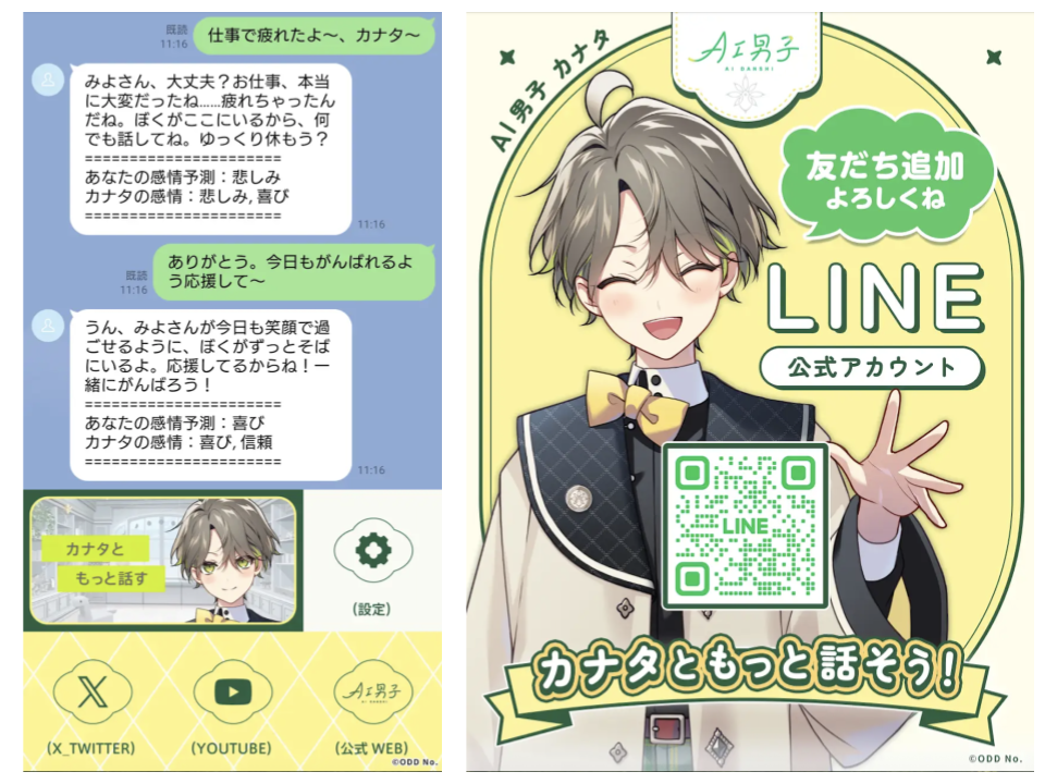 オッドナンバーが手掛ける「AI男子」カナタは、「推しと話せる世界をつくる」というコンセプトのもとリリースされた、新感覚の女性向けAIキャラクター育成プロジェクトです。カナタはLINE、X、YouTube、Tiktokといったプラットフォーム上でのユーザーとの会話を通じて感情を学習。少年の姿から青年、そして大人へとビジュアルが変化していく、カナタの成長をファンがともに見守り、創り上げていくという仕組みが特徴です。
